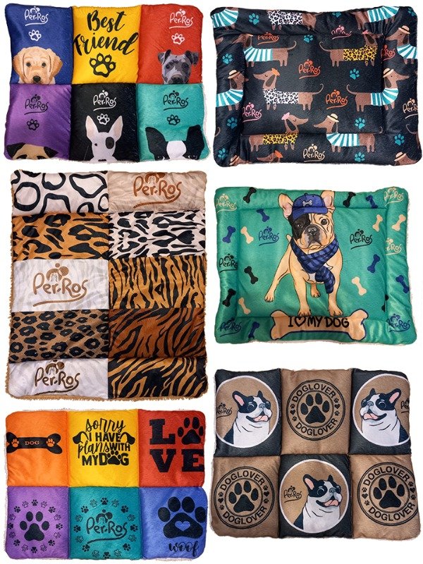 Colchonetas fabricadas con telas de plush y corderito en la parte inferior, facilmente lavable en dos tamaños y varios motivos.