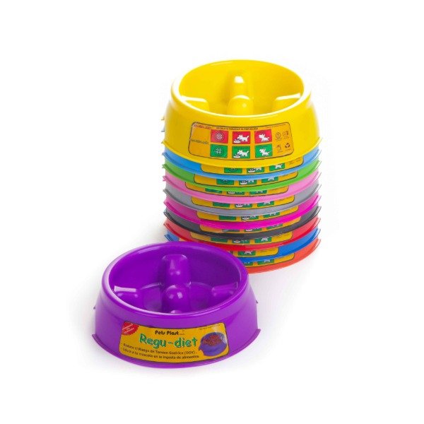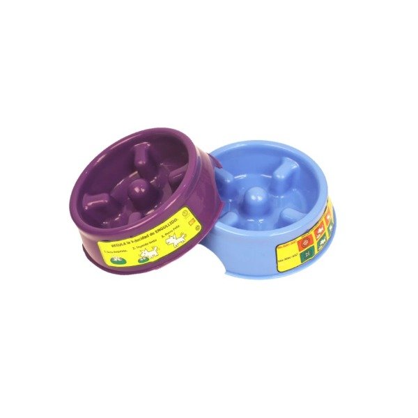 Comedero plastico que incorpora habitaculos internos a fin de que la mascota coma lentamente.