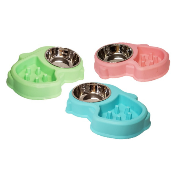Comelento doble plastico con sector de bebedero que incluye recipiente de acero inoxibable para la bebida. 3 Colores.